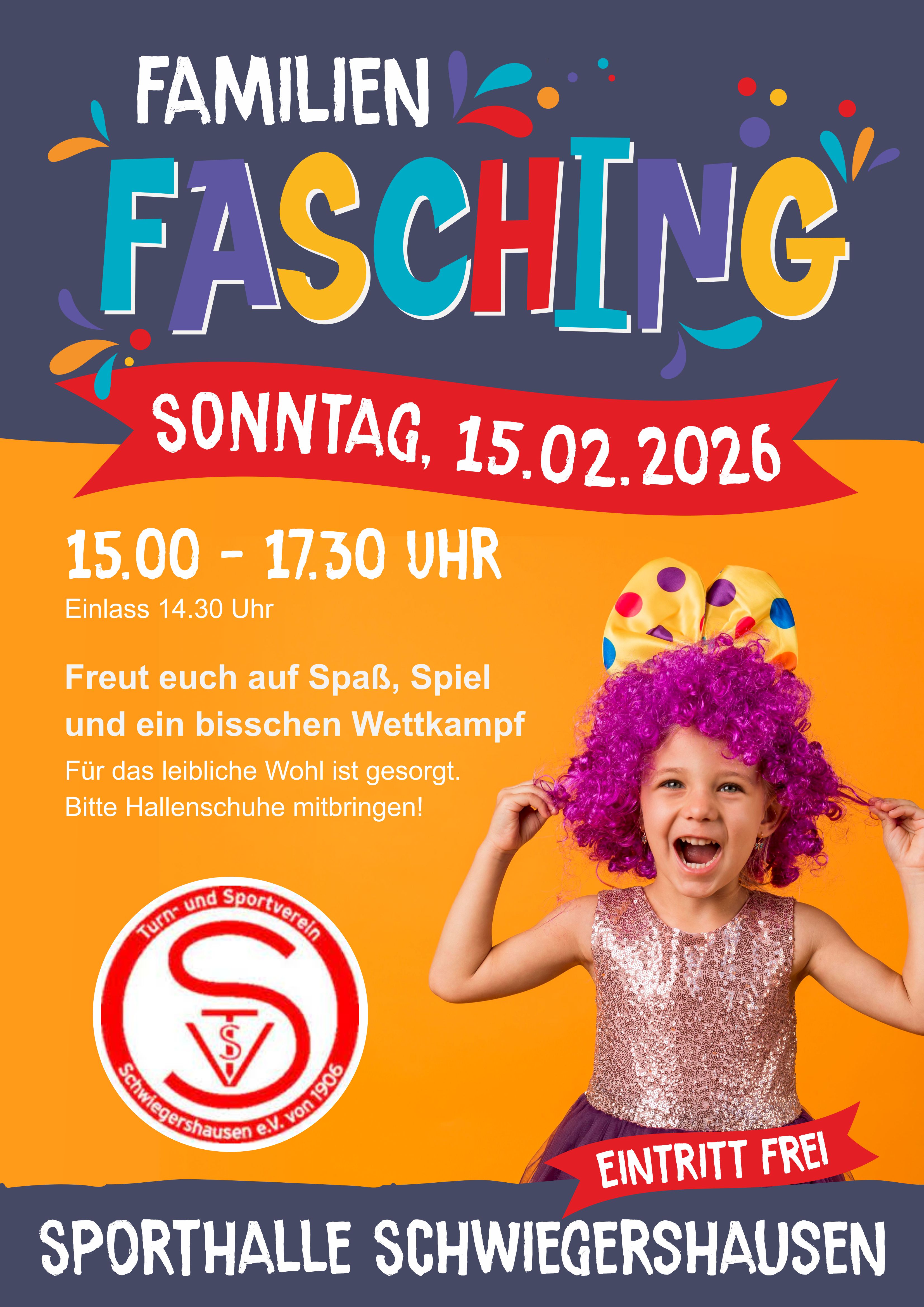 Am 15.02.2026 von 15-17:30 Uhr findet wieder unsere Faschingsparty für Familien in der Sporthalle statt. Wir freuen uns auf euch :-)